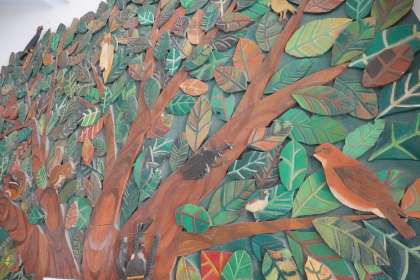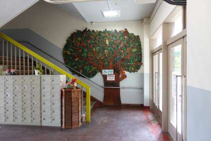 この作品はしょくいんしつの近くにあります。いつもみなさんが給食をはこんでいるかいだんにあるので、すぐわかると思います。