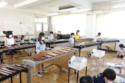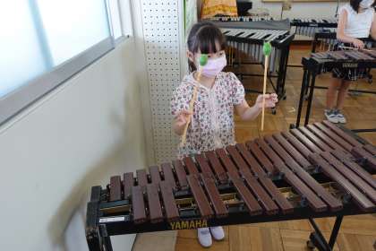 午後の音楽の授業です。初めて音楽室の楽器に触れ、楽しそうです。