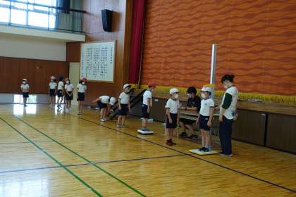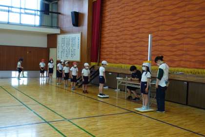 いつもなら保健室で行う2計測(身長と体重の計測)ですが、感染症対策から体育の授業の前に体育館で行っています。