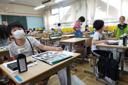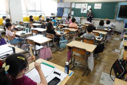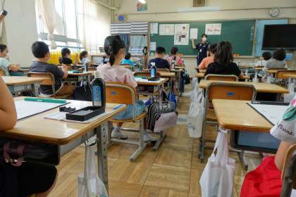 3年2組です。書道の時間です。