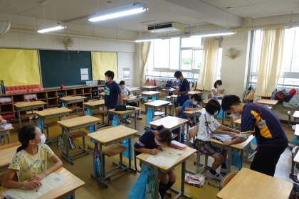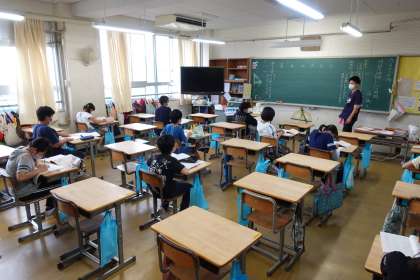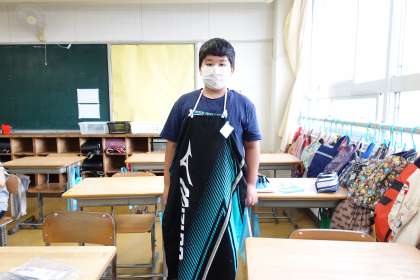 家庭科の授業です。完成したエプロンを見せてくれました。