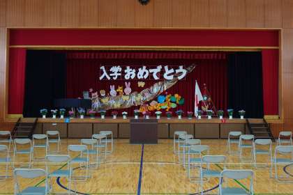 入学式は「桜」のイメージなのですが、今年は舞台上に「アジサイ」が並んでいます。