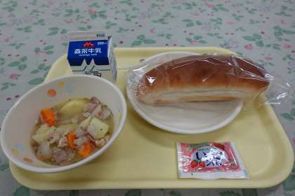 今日の献立はコッペパン、洋風含め煮、イチゴジャム、牛乳です。