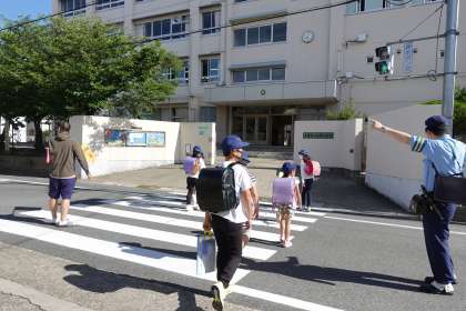 さわやかな朝を迎えました。今日は四條畷警察交通課のおまわりさんが登校指導に来てくださいました。ありがとうございます。