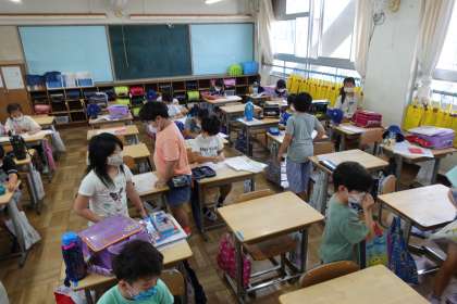 写真は朝の準備をする3年生です。みんな運動場に遊びに行っています。
