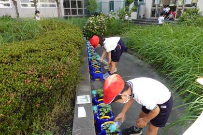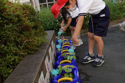 1年生が朝顔に水をあげています。朝顔の成長から、色々なことを感じて色々なことを学んでほしいです。
