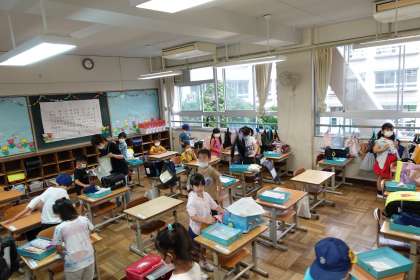 写真は朝の準備をする1年生です。
