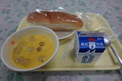 今日の献立は、コッペパン、かぼちゃのクリーミースープ、りんご、牛乳です。