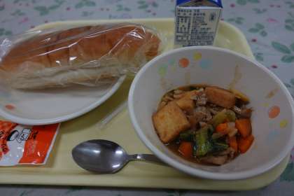 今日の献立は、コッペパン、厚揚げの五目炒め煮、ミルクバター、牛乳です。