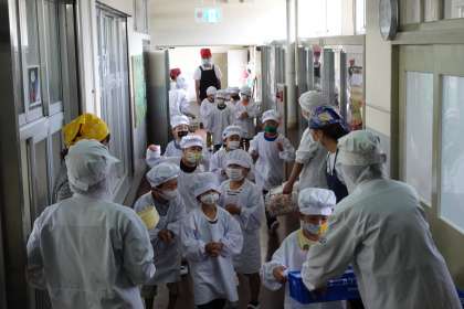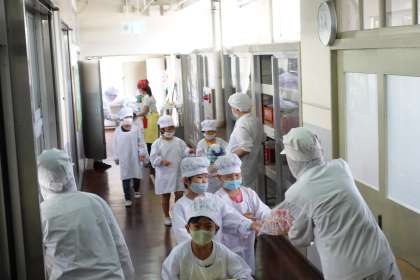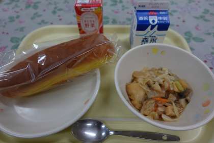 今日の献立は、パンプキンパン、魚のオイスターソース、野菜ジュース、牛乳です。