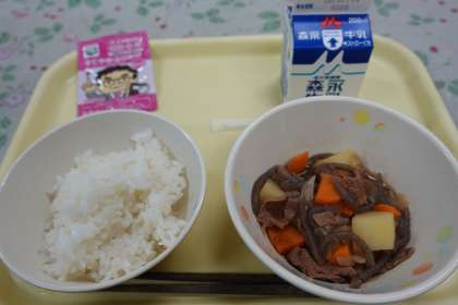 今日の献立は、ご飯、肉じゃが、ふりかけ、牛乳です。
