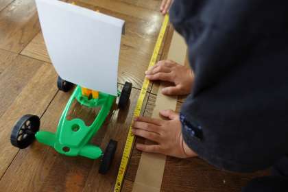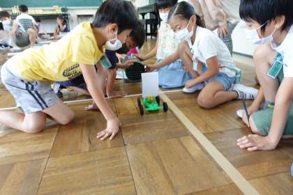 こちらも理科の実験です。「風の力の働き」について実験を行っていました。