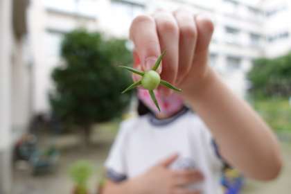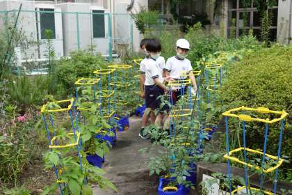 「トマトができている」と教えてくれました。落ちてしまっていたトマトを手に取って見せてくれました。