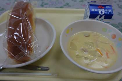 今日の献立は、キャロットパン、豆乳ポタージュ、牛乳です。
