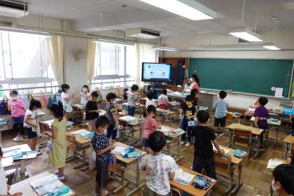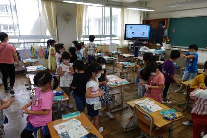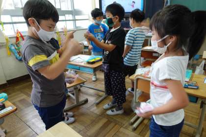 1年1組の算数です。引き算の勉強をしています。今日は、答えが「4」になるカードを友だちと見せ合って確認しています。