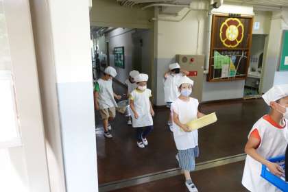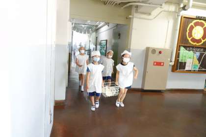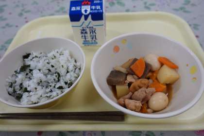 今日の献立は、青菜わかめご飯、関東煮、牛乳です。久しぶりのご飯です。
