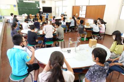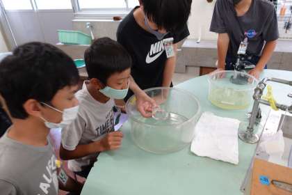 6年2組の理科です。中庭にある噴水の水を観察しています。ミジンコなど、たくさんの生き物がいます。