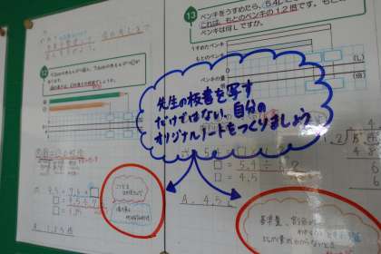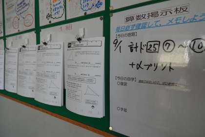 5年生の学年フロアーにある掲示板です。自学用のプリントが自由に取れる工夫や、子どもたちの自学ノートが紹介されています。