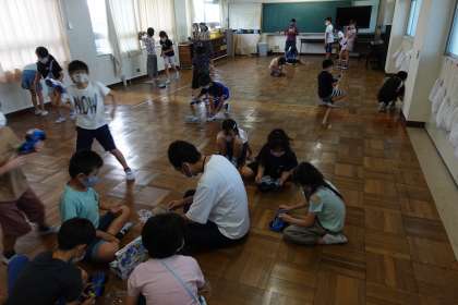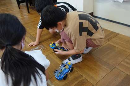 3組です。授業で作成したモーターカーを使って、乾電池のつなぎ方を学習しています。