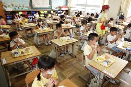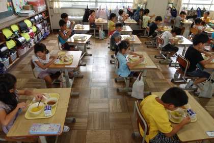 1年2組です。アジフライ増量を希望する人が、手を挙げています。