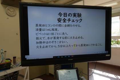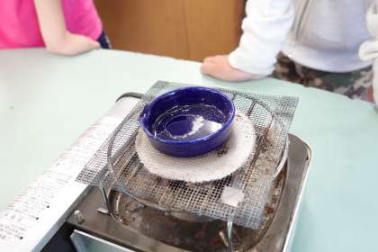 理科の実験です。食塩水や薄いアンモニア水などを蒸発させて、残った成分を観察しています。