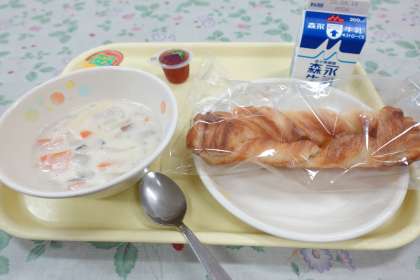 今日の献立はホワイトシチュー、デニッシュパン、ぷちゼリー、牛乳です。