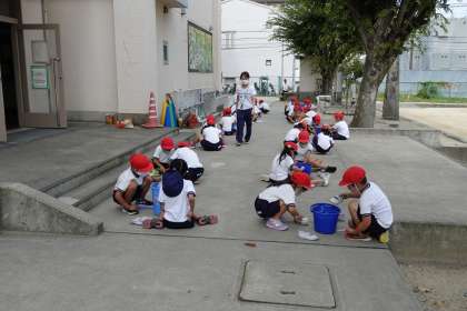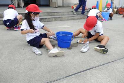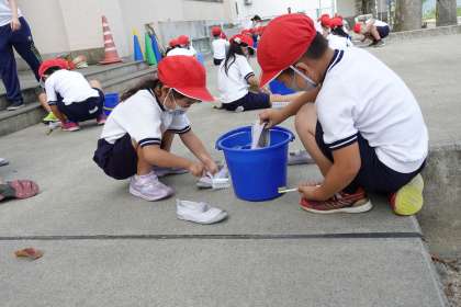 1年2組の授業です。自分たちの上靴を一生懸命洗っています。