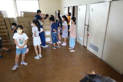 4年2組の様子です。まずは、氷野小学校の横にある防災倉庫を見学させていただきました。