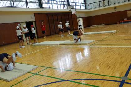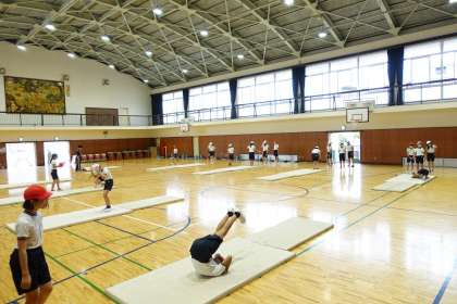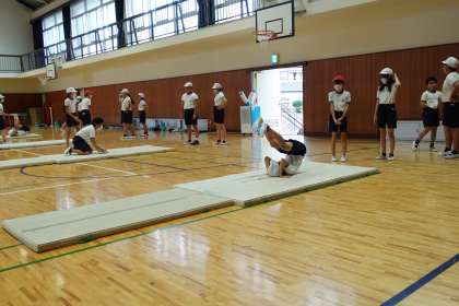 体育が続きます。こちらは6年3組です。マット運動の練習中です。