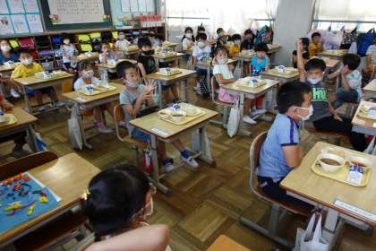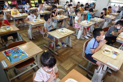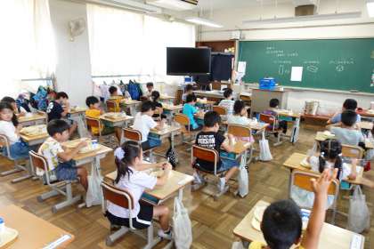 1年2組です。魚のフライ大盛り希望者がじゃんけんをしています。