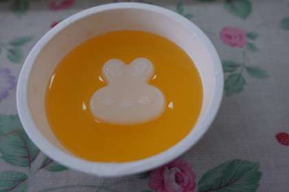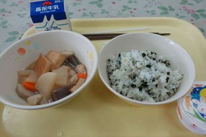 今日の献立は、鶏肉と里芋のゴマ煮、青菜わかめご飯、月見ぜりー、牛乳です。月見ゼリーのふたを開けると可愛いウサギが出てきました。子どもたちも喜んでいました。
