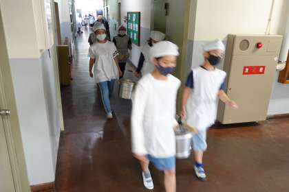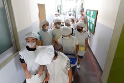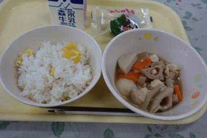 今日の献立は、栗ご飯、けんちん煮、かしわもち、牛乳です。