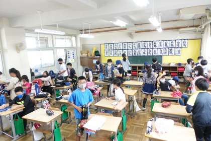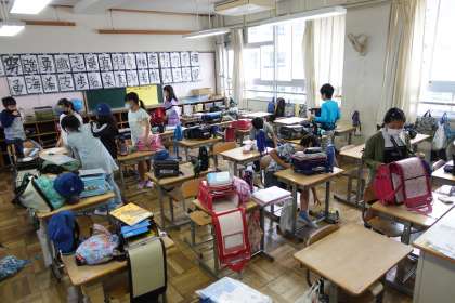 朝の準備をする5年生です。