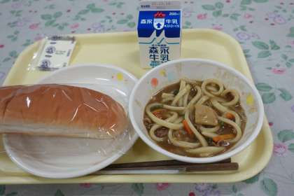 今日の献立は、コッペパン、カレーうどん、ソフトチーズ、牛乳です。献立を見て、「今日はカレーうどんだ!」と喜んでいた人が大勢いました。人気メニューですね。