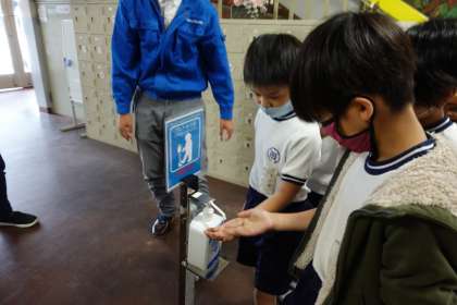 「地元大東市に貢献したい」とのことで、御領にある(株)京伸様とタグを組んで足踏み式アルコールスタンドを製造・販売されておられますが、御領が校区でもある氷野小学校にとのことで、今回ご寄贈いただきました。