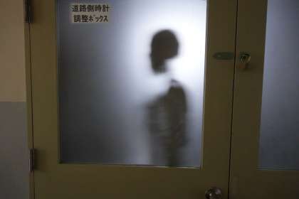 4年生フロアーの倉庫です。武林先生が、理科の授業で使う骨格模型を理科室から倉庫に移しなおしたのですが、光のイタズラでこんなことに・・。