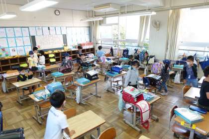 朝の準備をする1年生です。