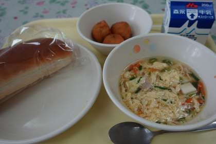今日の献立は、ハニーパン、五目卵スープ、たこやき、牛乳です。