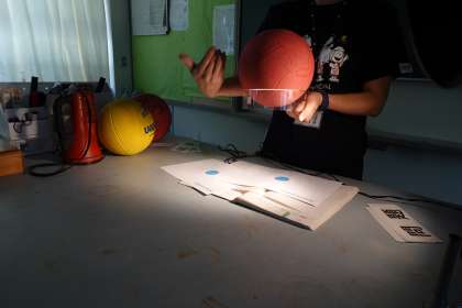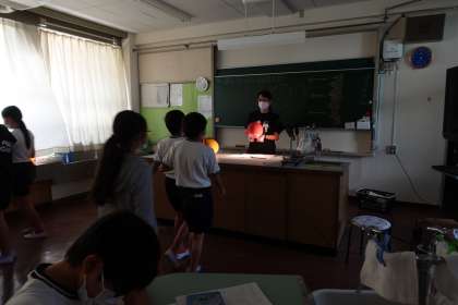 理科の授業です。廊下から理科室を見ると暗いので驚きましたが、授業の様子を見て納得です。「月の満ち欠け」について実験していました。