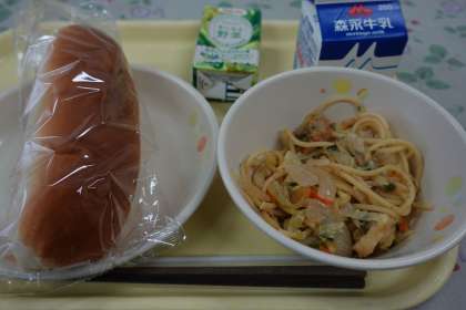 今日の献立は和風スパゲティ、コッペパン、野菜ジュース、牛乳です。