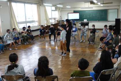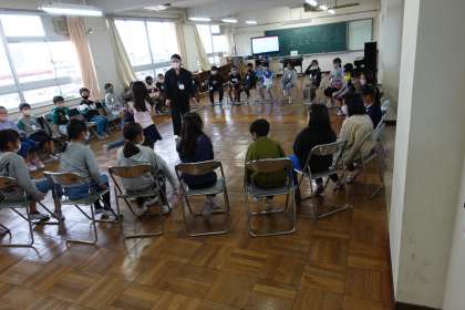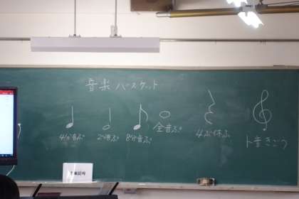 3年2組は音楽の授業中でした。今日は多目的室で、音楽記号を使った「音楽バスケット」を行いました。