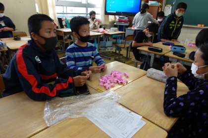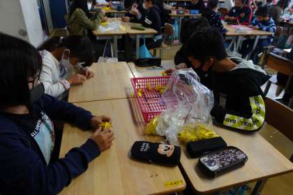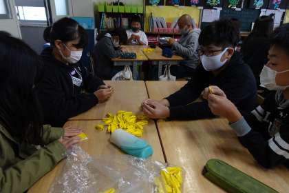 6年生です。他学年が作ってくれた折り鶴をチェックし、折りなおしています。