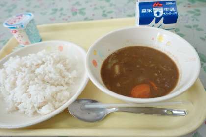 今日の献立は、麦ごはん、カレーシチュー、ヨーグルト、牛乳です。