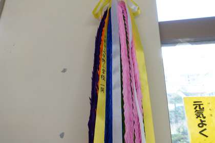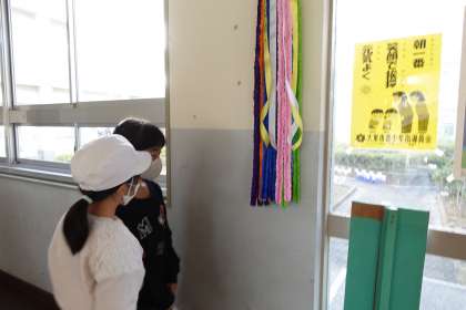 下足室前に飾られている立派な千羽鶴です。6年生の気持ちがこもっています。いよいよ来週は修学旅行ですね。