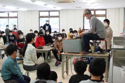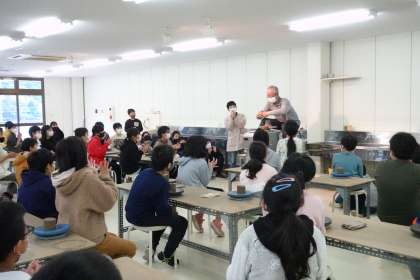 いよいよ陶芸体験です。体験の前に、電動ろくろを使った実演のすばらしさに全員感動です。