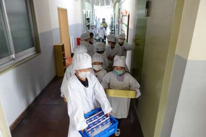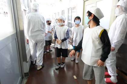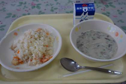 今日の献立は、えびピラフ、きのこのポタージュ、牛乳です。