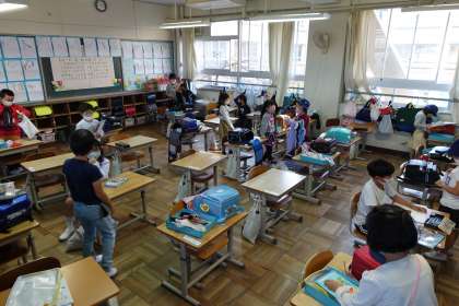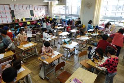 朝の準備をする1年生です。