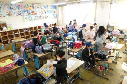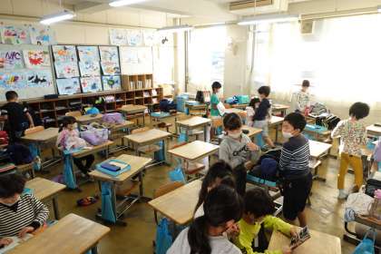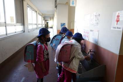朝の準備をする2年生です。手洗いもしっかり行っています。