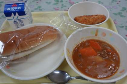 今日の献立は、ビーフシチュー、米粉ハムカツ、コッペパン、牛乳です。