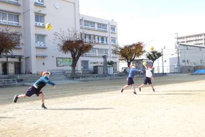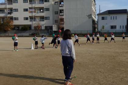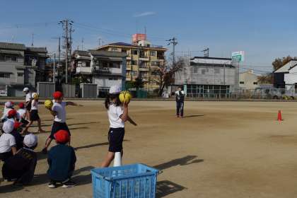 1年1組、2組の体育です。ボール投げの練習をしていました。どういう風に投げると遠くまで届くかな?